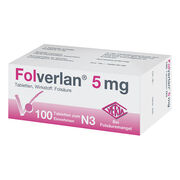Folverlan 5 mg. Wirkstoff: Folsäure-Hydrat. Anwendungsgebiete: Behandlung von Folsäuremangelzuständen, die diätetisch nicht behoben werden können. Hinweis: enthält Lactose. Verla-Pharm Arzneimittel GmbH & Co. KG, Hauptstraße 98, 82327 Tutzing.