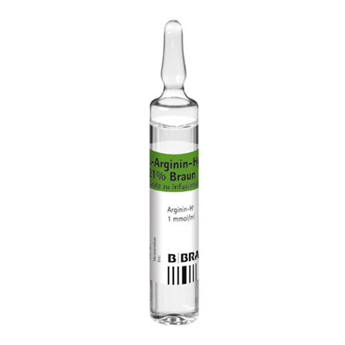 L-Arginin-Hydro-chlorid 21% Braun. Konzentrat zur Herstellung einer Infusionslösung. Anwendungsgebiete: Zur Behandlung schwerer metabolischer Alkalosen (Alkaliüberschuss bzw. Untersäuerung); in der Pädiatrie (Kinderheilkunde) zur Absenkung erhöhter Konzentration von Ammoniak im Blut (Hyperammonämie) durch schwere angeborene Stoffwechselstörungen. B. Braun Melsungen AG, 34209 Melsungen.
