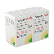 Pangrol 25000. Wirkstoff: Pankreas-Pulver vom Schwein. Anwendungsgebiete: Zur Behandlung von Verdauungsstörungen, die durch eine verminderte oder fehlende Funktion der Bauchspeicheldrüse verursacht werden. Berlin-Chemie AG, 12489 Berlin.